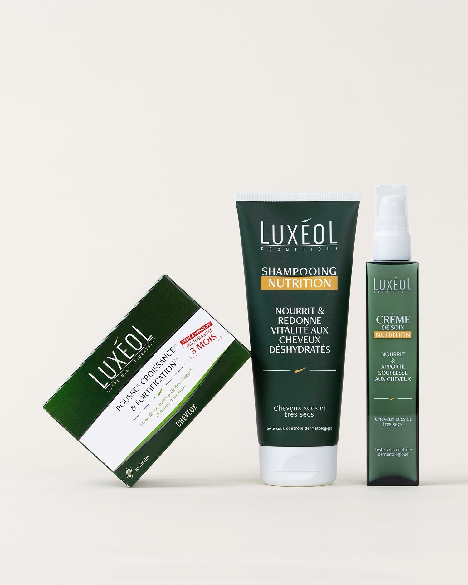 La routine cosmétique Nutrition (shampooing et crème de soin) complète l’action en nourrissant et fortifiant la fibre capillaire. Le shampooing nutrition, enrichi en beurre de karité, kératine hydrolysée et provitamine B5, nettoie en douceur tout en restaurant la souplesse et la vitalité des cheveux secs, frisés ou déshydratés. La crème de soin nutrition, sans rinçage, nourrit intensément sans alourdir, facilite le coiffage et apporte douceur et brillance.